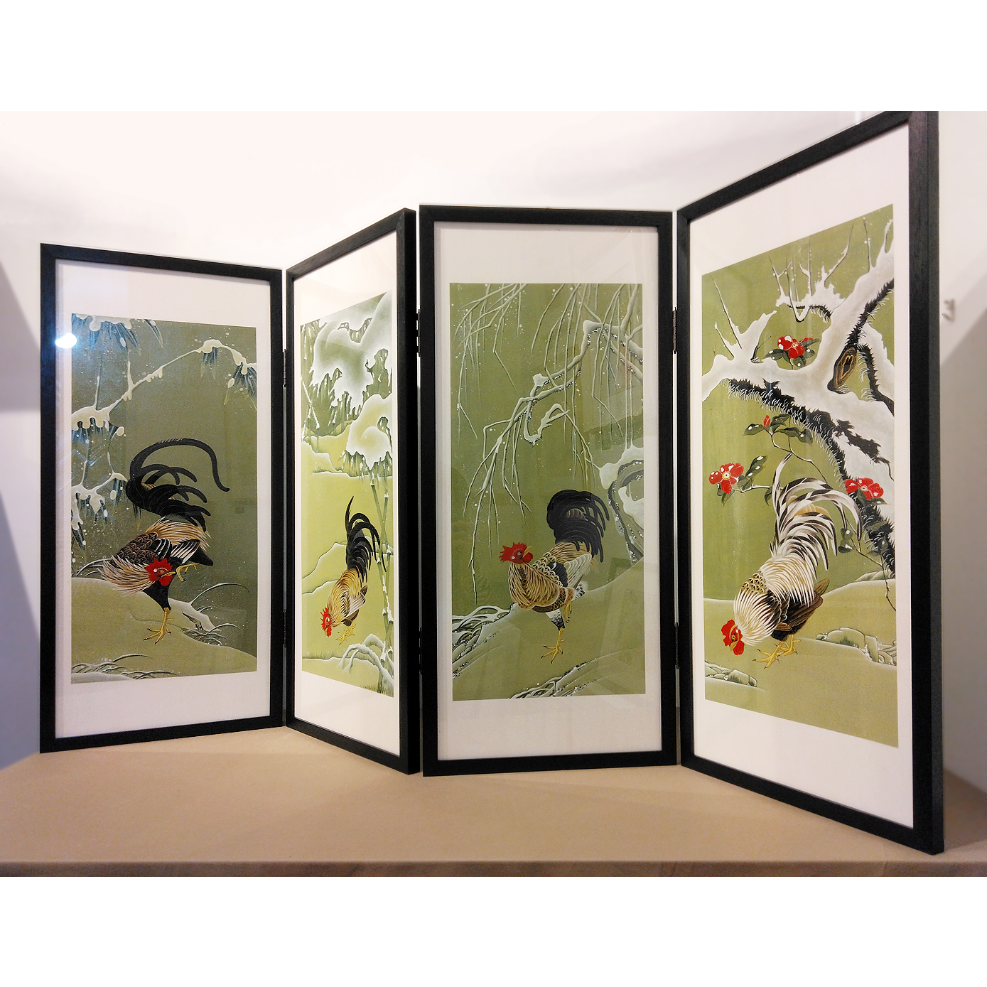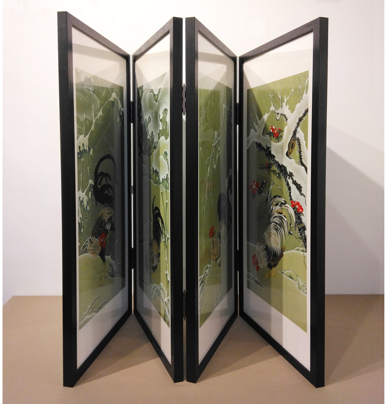 縦長の木板に描かれた鶏の絵が4点。
